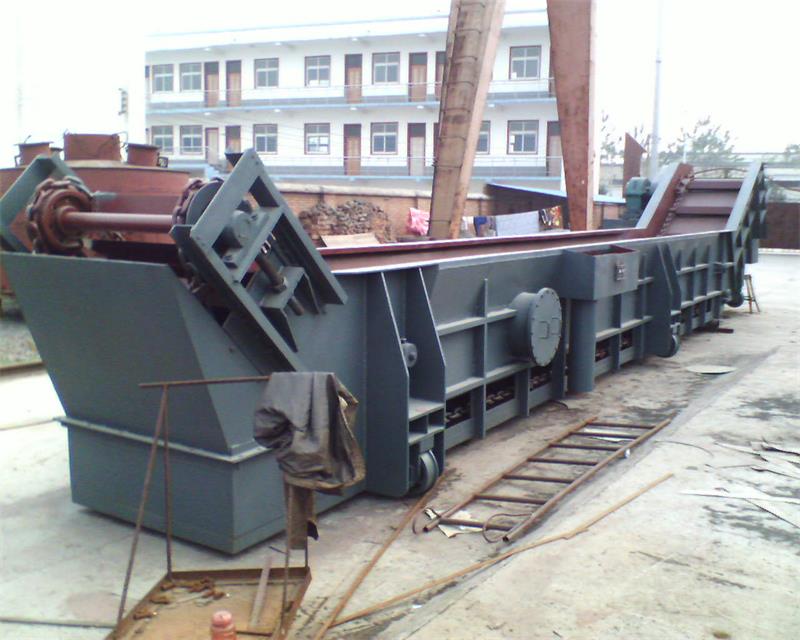 该机适用于锅炉排渣之用。其机械部分主要有关断门和捞渣机两部分,其工作原理如下:炉渣自冷灰斗经关断门落入捞渣机的上槽体内,槽内储满冷却落入捞渣机的上槽体内,槽内储满冷却水(水温≤60℃),红渣骤冷粒化后,经环形链条牵引的角钢型刮板提升,脱水后,可直接装车或采用皮带机集中后装车外运,供综合利用;亦可经碎渣机破碎后进入渣池,水力输送。下槽体内无水,刮板回空时由此通过。上槽体的出渣段及下槽体中都铺有铸石板以防磨损。捞渣机设有可回转90°的轮子,整机可做纵横两个方向的移动。