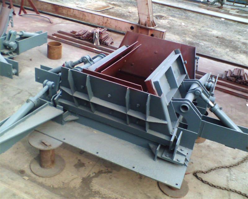 液压关断门主要由关断门座架、动臂架、侧门及前后端门组成,经常使用的关断门分别由4块门,8块门,12块门,20块门组成(前后门各一块)。当捞渣机正常运行时,各块门呈开启状态,捞渣机检修时,关断门通过液压系统或电动机构带动动臂架,从而使各块关闭。